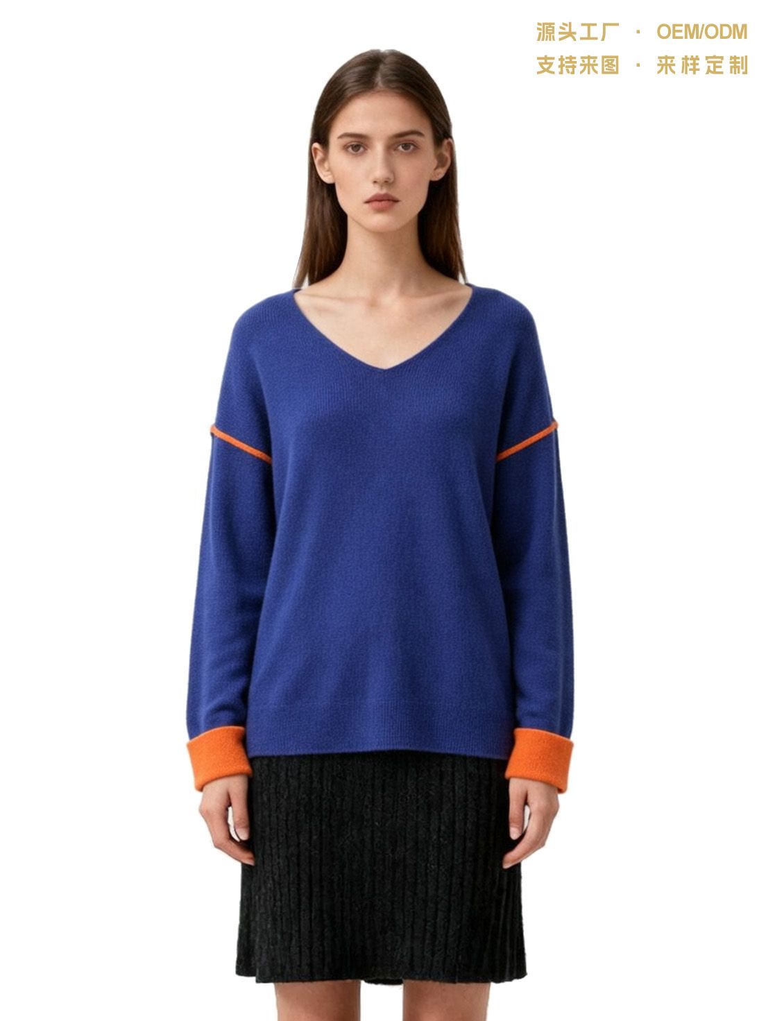 秋冬新款宝蓝撞色条针织衫女V领宽松慵懒时尚打底毛衣
